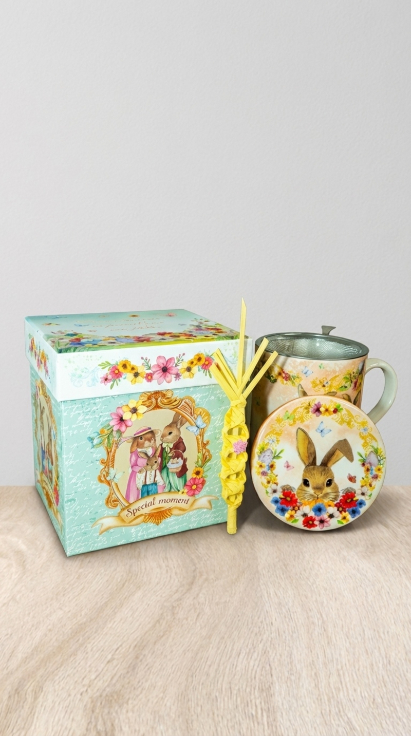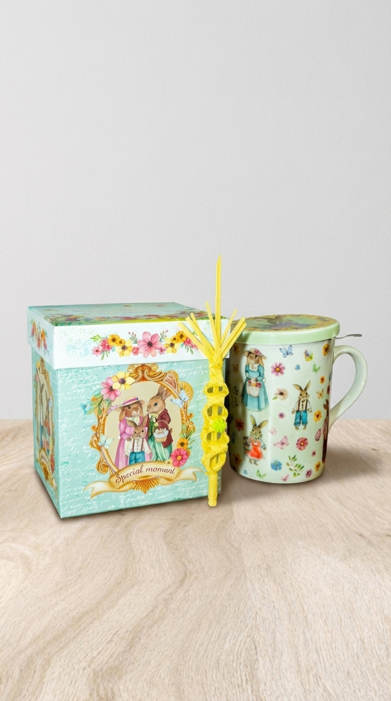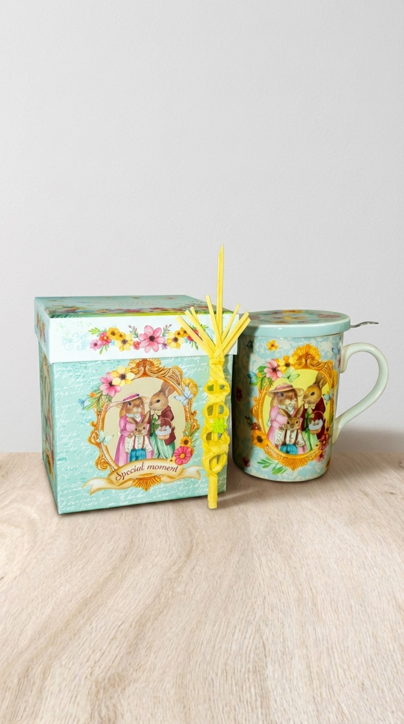 Estas preciosas tazas de infusiones serán la delicia de tus padrinos, con una presentación espectacular en una elegante caja con motivos de Pascua,que también incluye una palma natural pequeña.