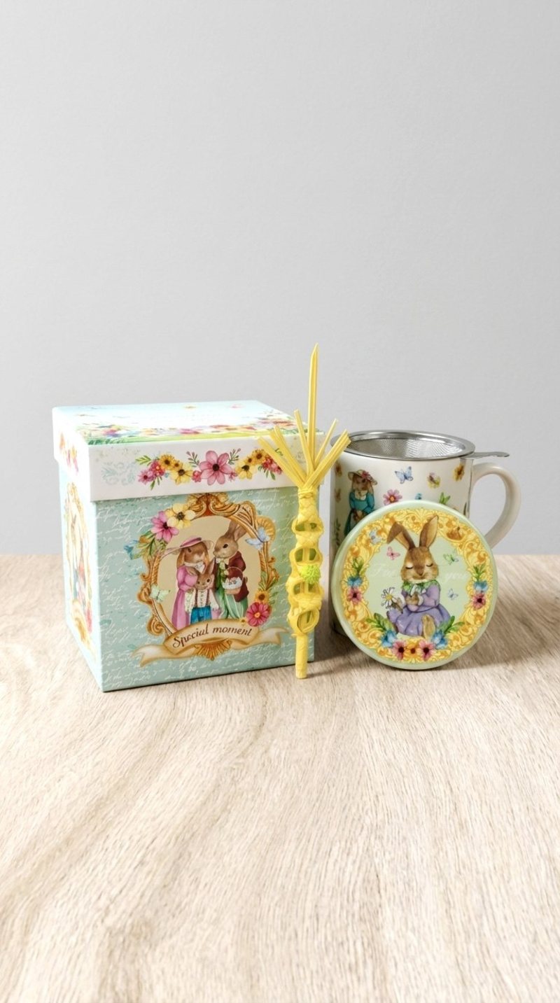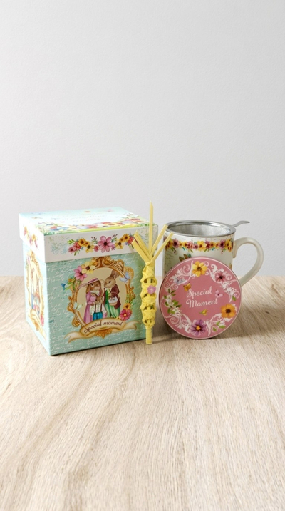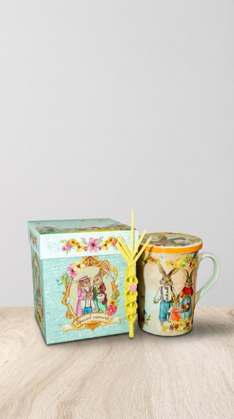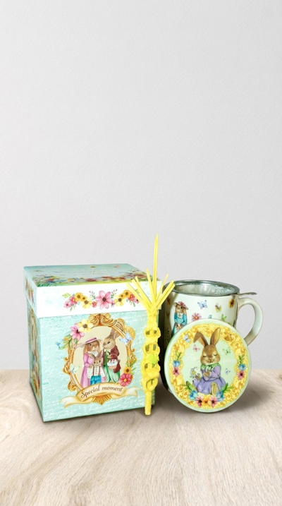Estas preciosas tazas de infusiones serán la delicia de tus padrinos, con una presentación espectacular en una elegante caja con motivos de Pascua,que también incluye una palma natural pequeña.