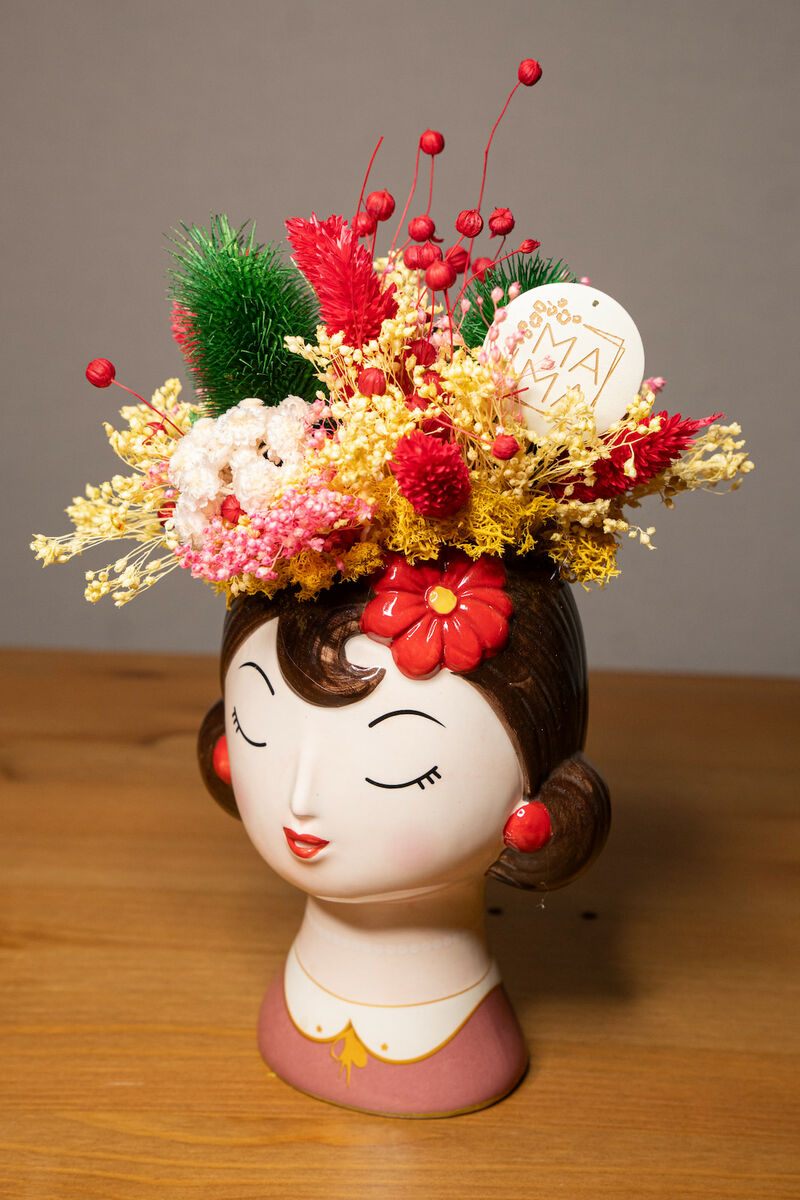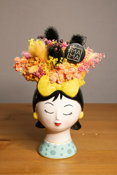 Esta original base en forma de cabeza trabajada con flores secas hará las delicias de cualquier madre en su día.