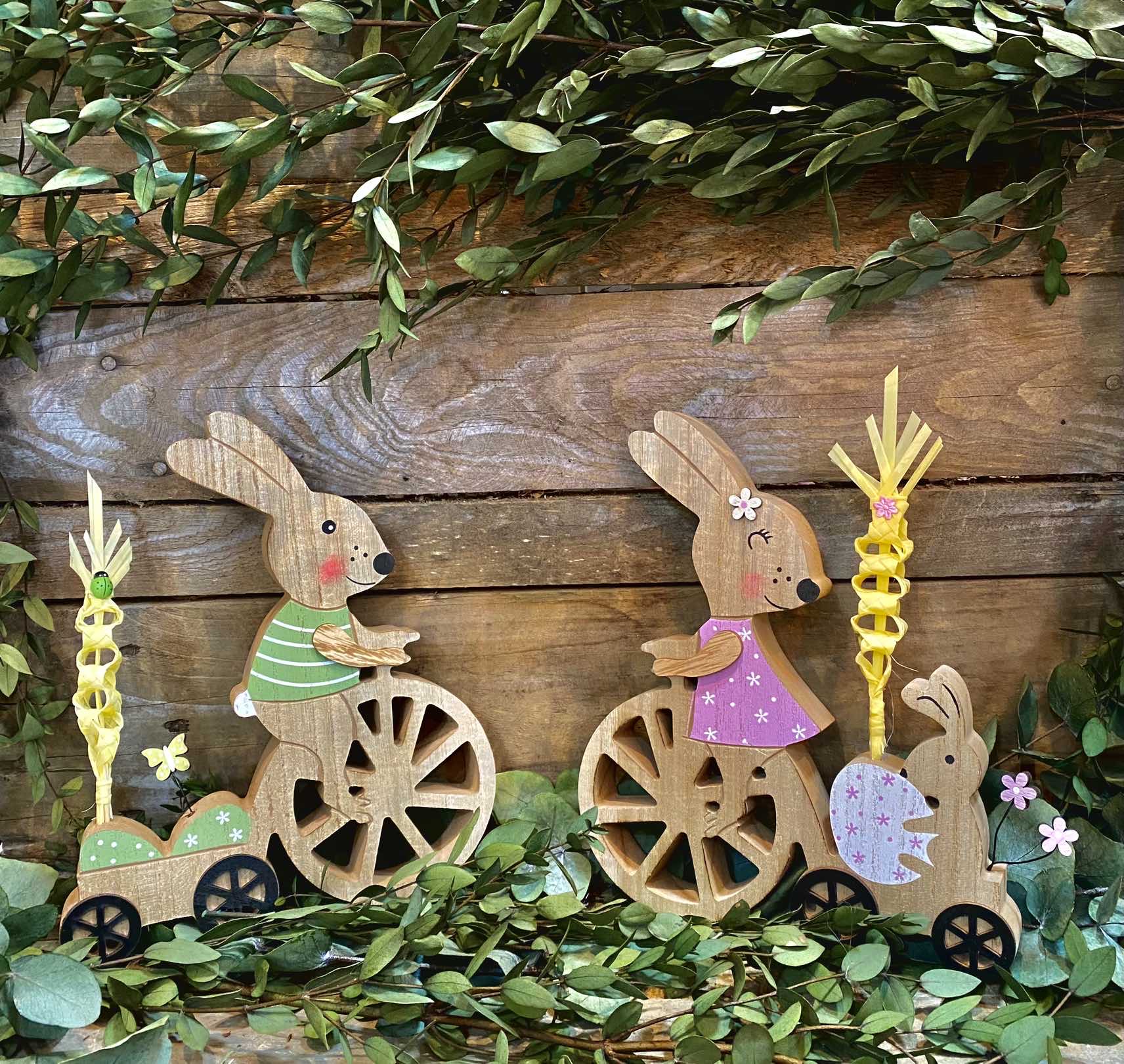 FIGURA DE MADERA CONEJOS DE PASCUA EN BICICLETA CON PALMA NATURAL