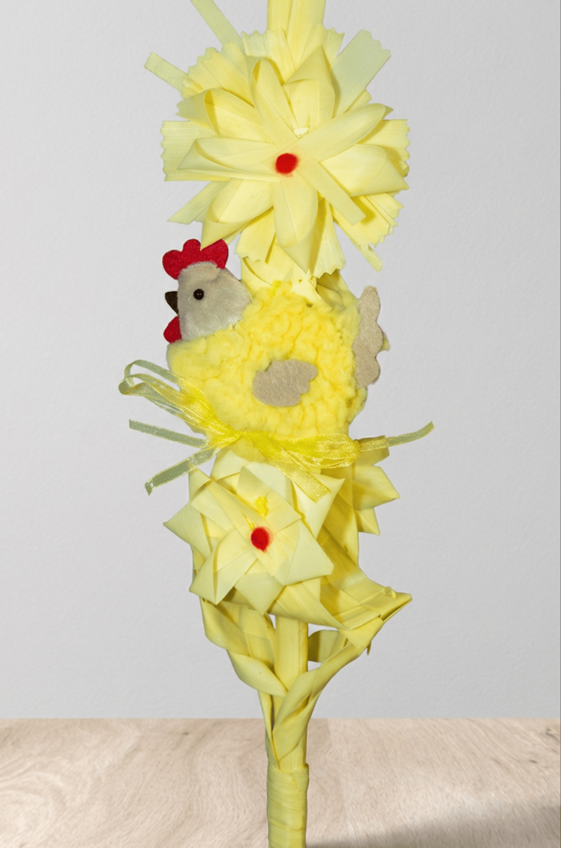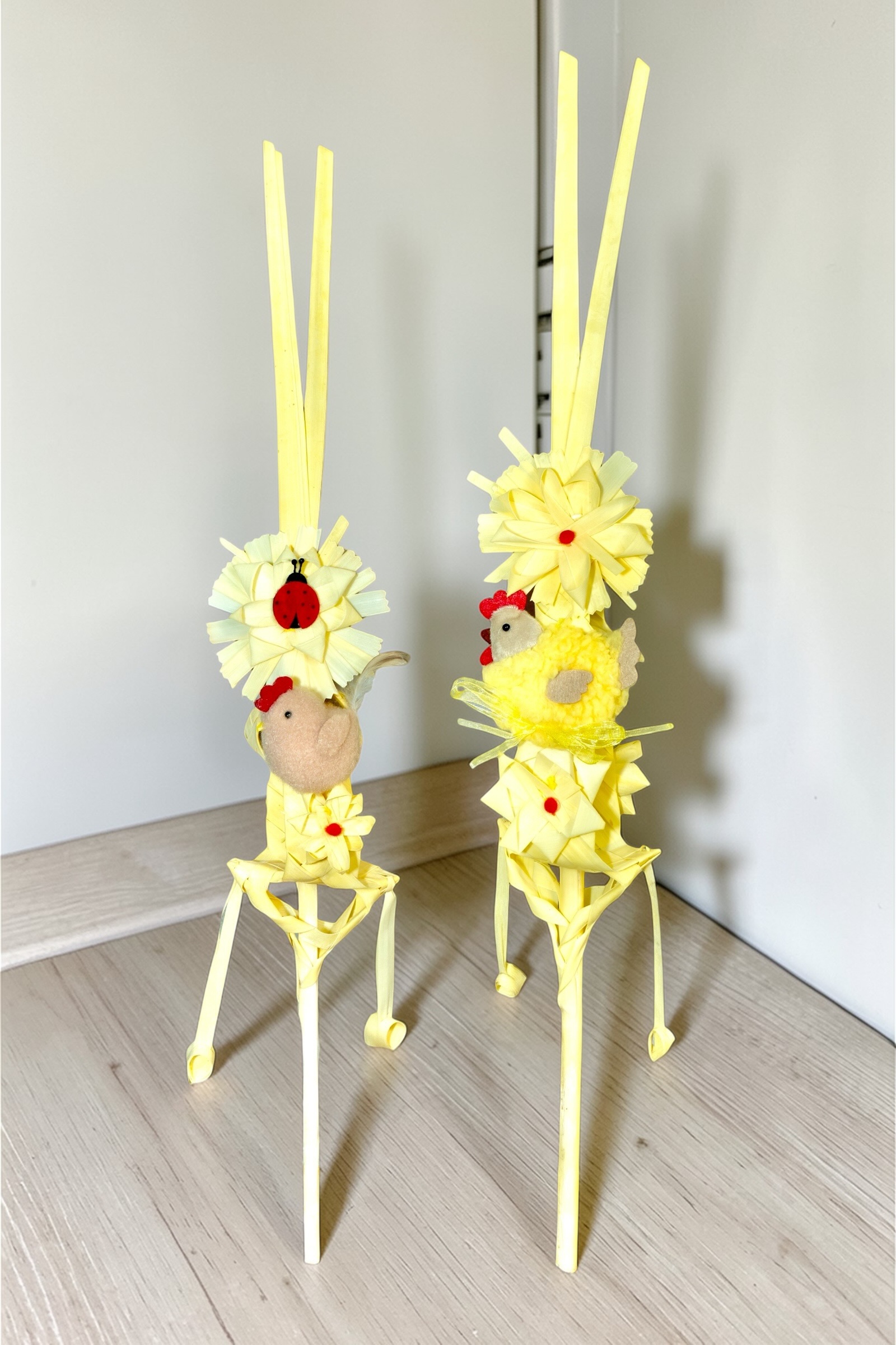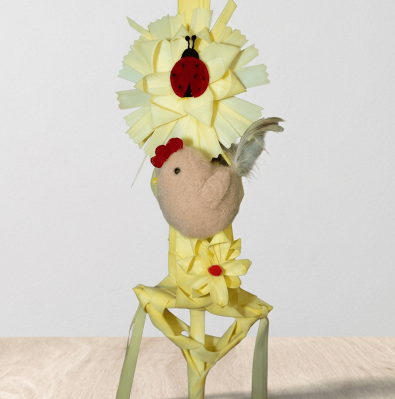 Estas bonitas palmas de Pascua decoradas, bien con una gallina de peluche y complementada con pompón,o un pollo complementado con mariquita, cualquiera de las dos  harán las delicias de tus padrinos.