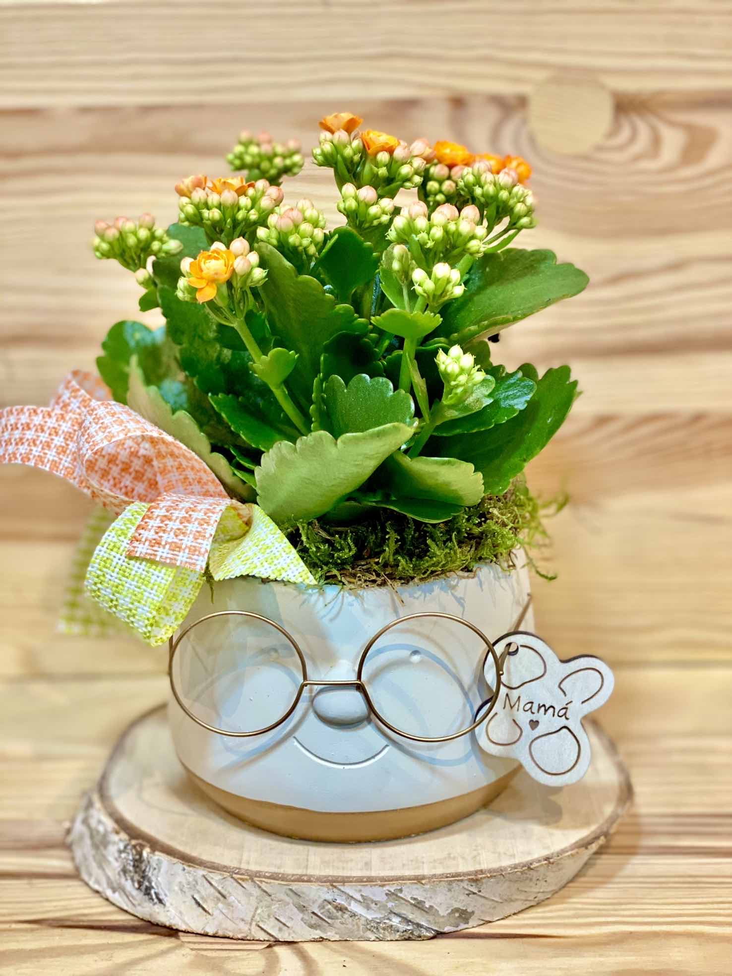 Te ofrecemos para mamá como regalo diferente y original , esta composición de maceta en cerámica con gafas y planta de Kalanchoe doble,sus tonos dorados y anaranjados no la dejarán indiferente.Será una elección de exito asegurado.
