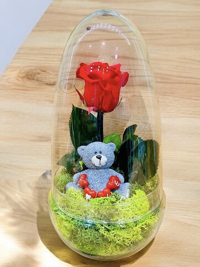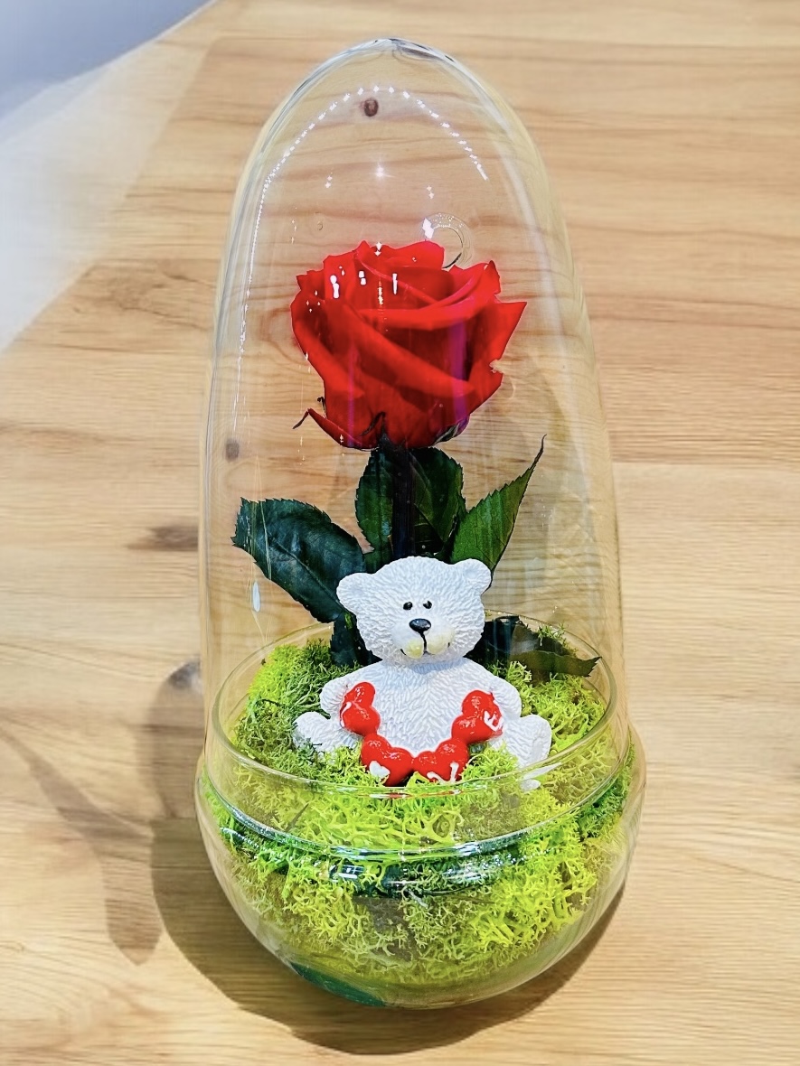 Esta bonita composición preservada en cúpula de cristal, hará las delicias de tu pareja en el día de San Valentín. Realizada con Rosa preservada, Musgo preservado y complementado con un bonito muñeco de resina.