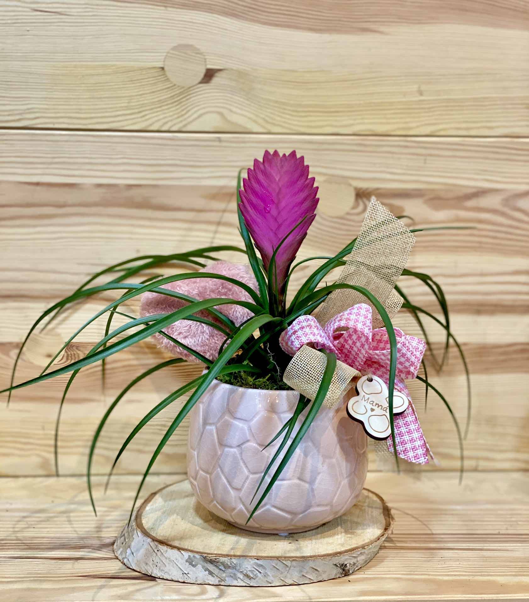 Bonitacomposición de  planta de Tillandsia en maceta de cerámica complementada con un precioso pink de corazón en suave pelo y colgante en madera con la palabra mamá. Sin duda hará las delicias de cualquier madre en su día.
