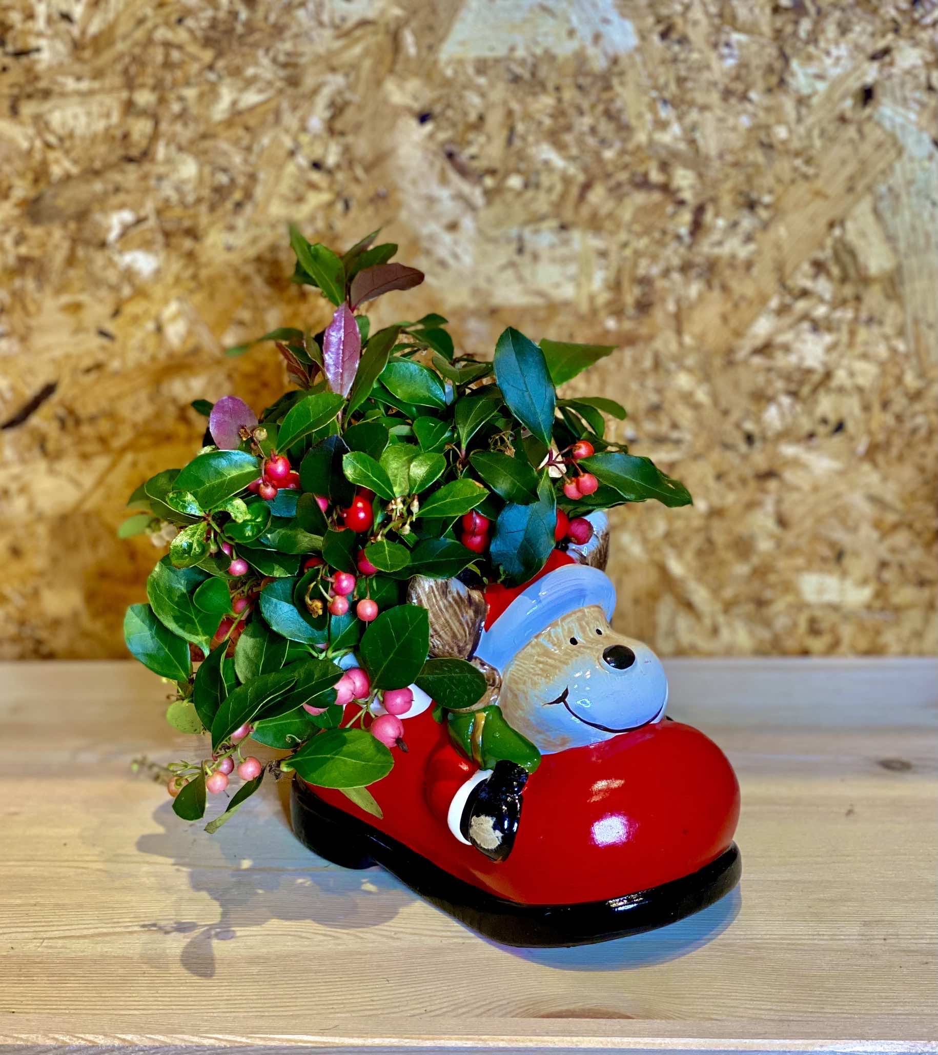 COMPOSICIÓN NAVIDEÑA DE GAUTHERIA SOBRE BOTA DE CERÁMICA DE RENO, IDEAL COMO DETALLE PARA ESTA NAVIDAD. SUS MEDIDAS APROXIMADAS SON DE 22X20X9CMS.