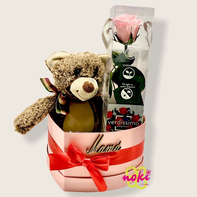 Regala a tu mamá  esta bonita caja con forma de corazón, en cuyo interior tiene un osito de peluche y una preciosa rosa preservada.Sin duda no la dejarás indiferente.Complementado para la ocasión con la palabra "mamá" en madera.