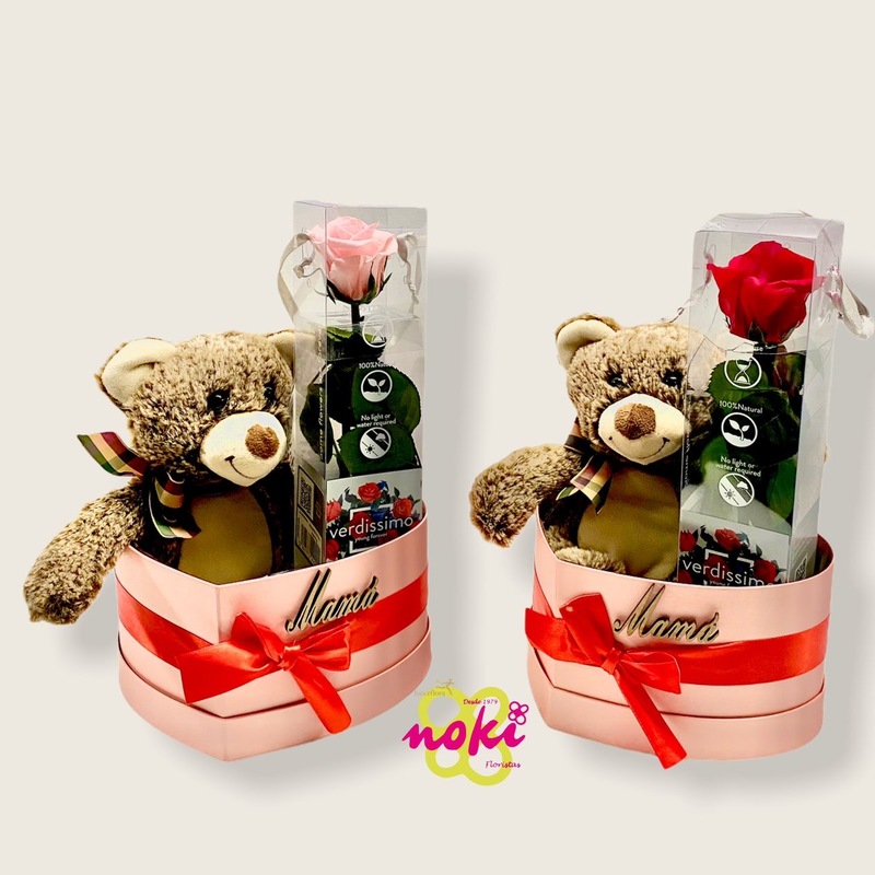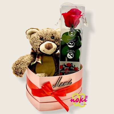 CAJA CORAZÓN CON PELUCHE Y ROSA PRESERVADA - Noki Floristas