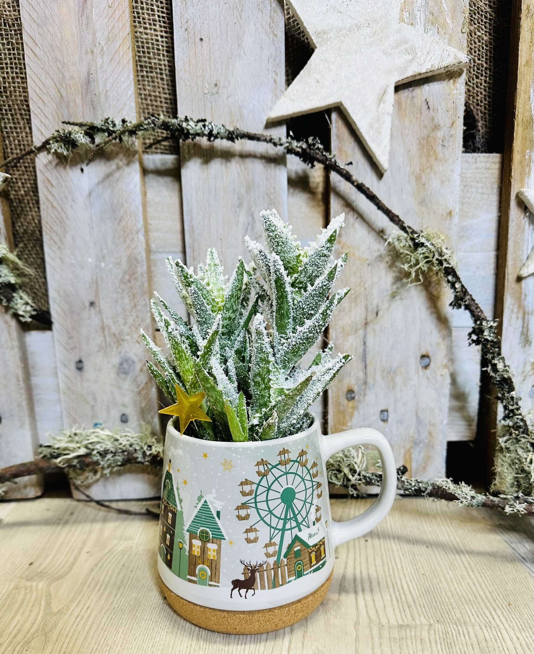 Sin duda un detalle elegante, que no dejará a nadie indiferente. Bonita composición sobre taza de cerámica decorada con motivos navideños con base de corcho. El cactus nevado hace que la composición tenga una gran durabilidad por su fácil cuidado.