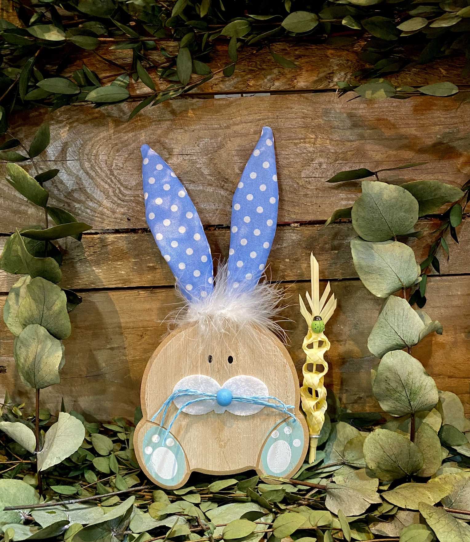 Original conejo de madera, con orejas móviles de tela complementado con plumas y bigotes.12x26x2cms.Incluye palma natural. Sin duda fascinará por su originalidad a tus padrinos.