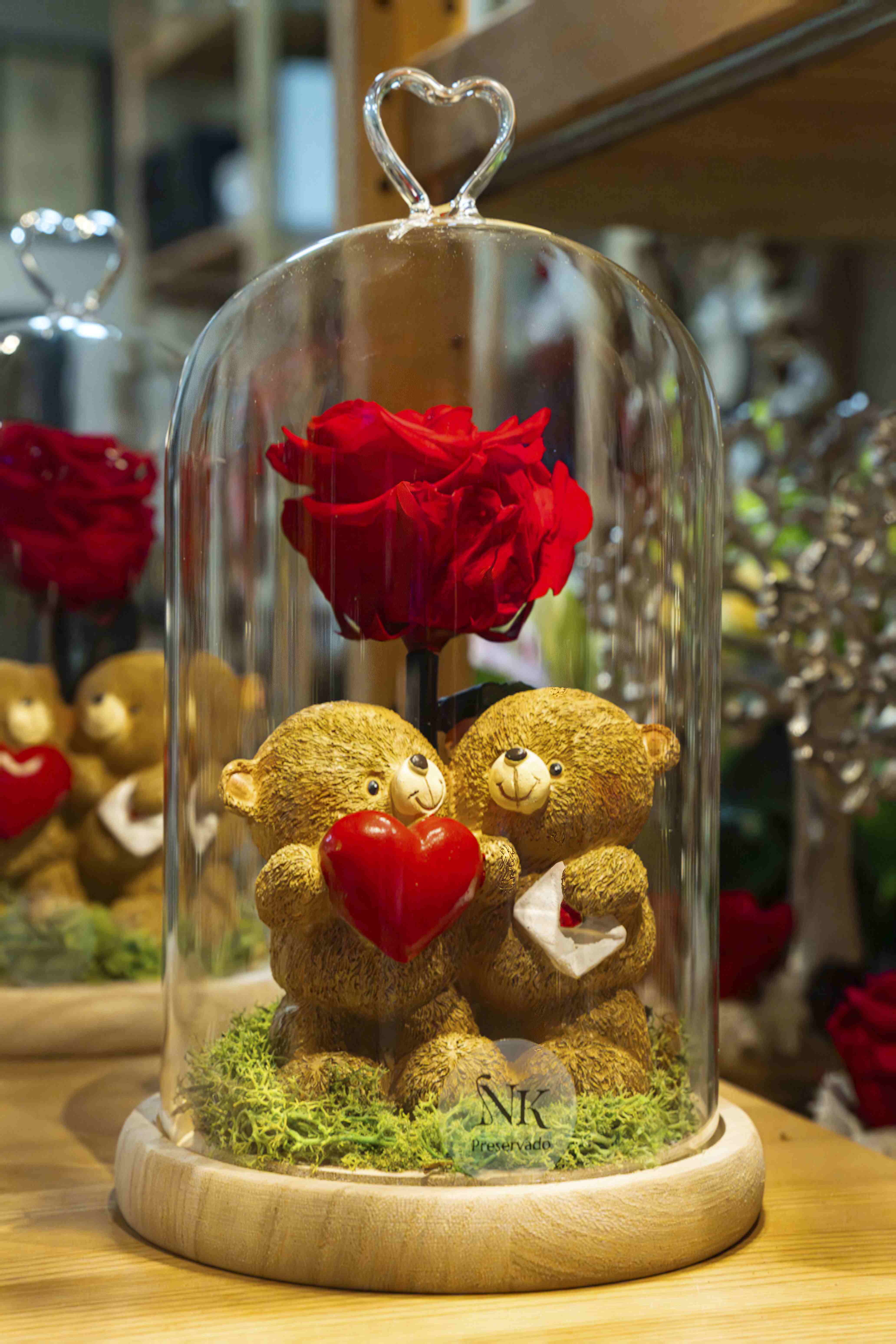 Un detalle romántico que se entiende a primera vista. Esta cúpula de cristal reúne una rosa preservada roja y una pareja de ositos enamorados, sobre una base natural con acabado decorativo. El resultado es un regalo tierno y elegante, pensado para emocionar y durar en el tiempo.