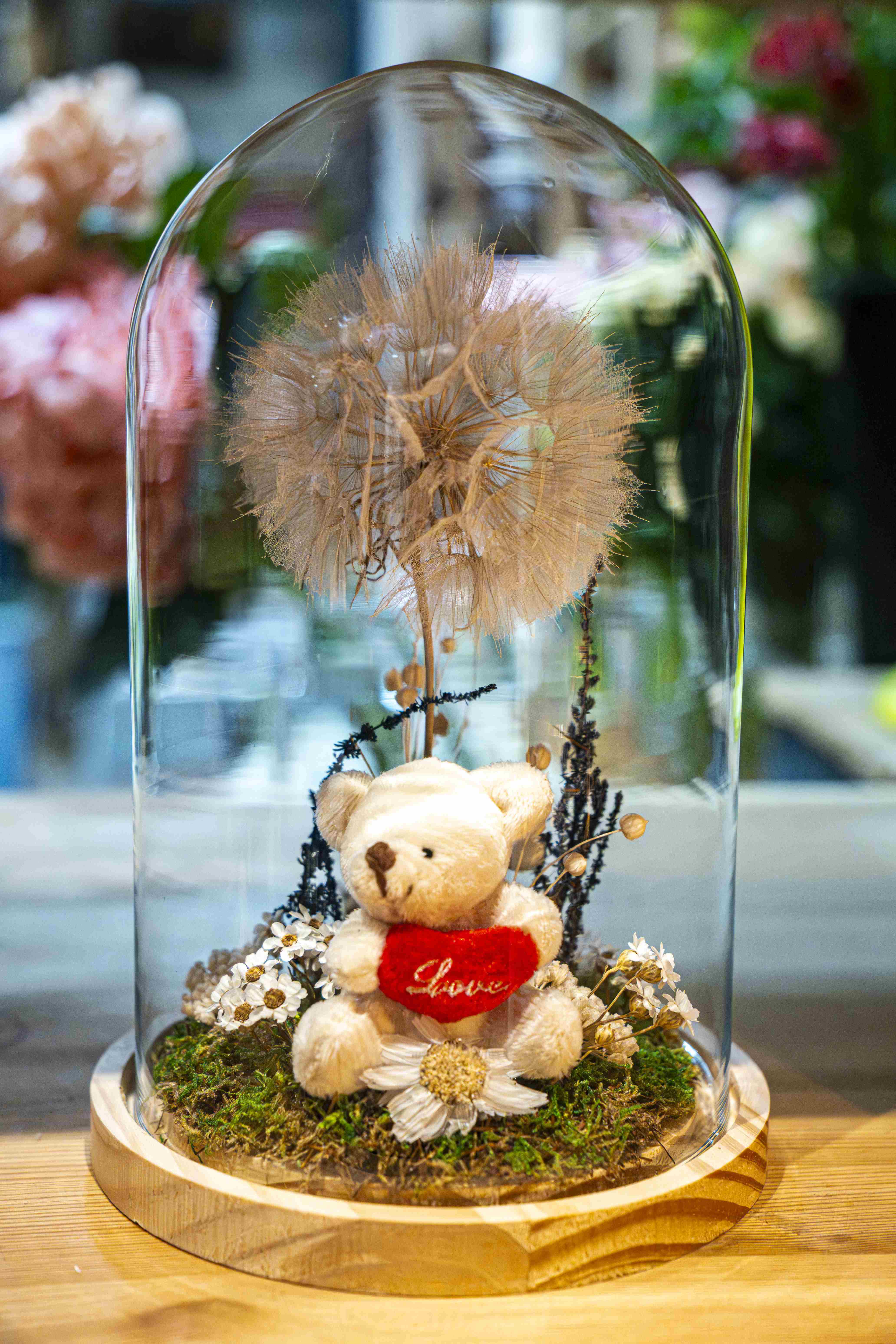 Un detalle delicado, romántico y diferente: un diente de león seco protegido bajo una cúpula de cristal, acompañado por un osito de peluche y pequeñas flores secas sobre una base natural con musgo. Una pieza decorativa que captura ese momento de deseo y ternura, hecha para regalar y para durar.