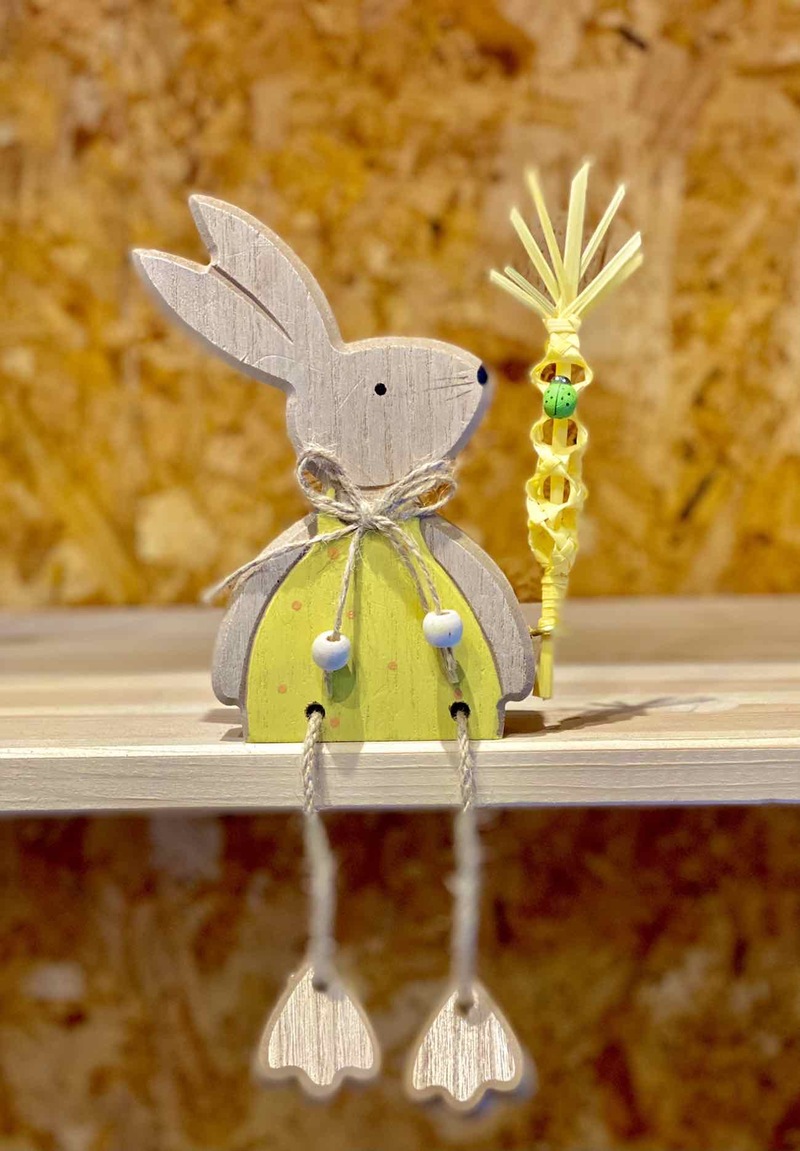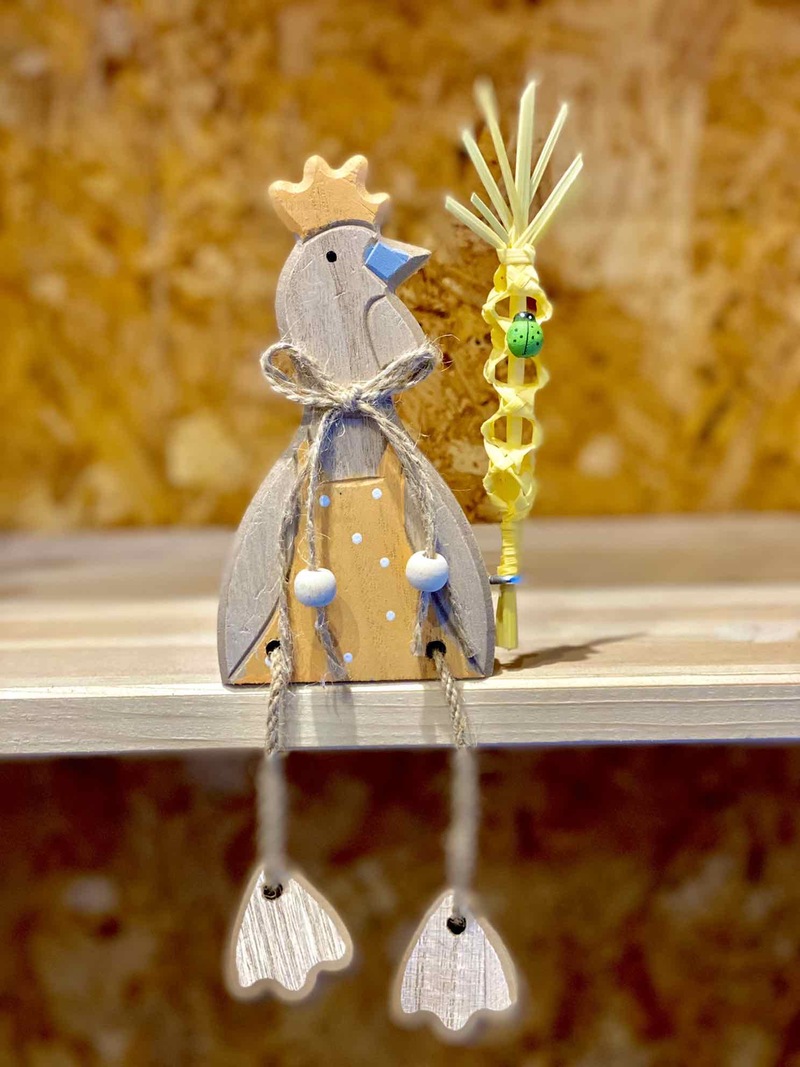 Originales figuras de madera con pies colgando, ideales para decorar cualquier rincón, complementadas con una palma natural, será el regalo más original que puedes dar a tus padrinos en esta Pascua.