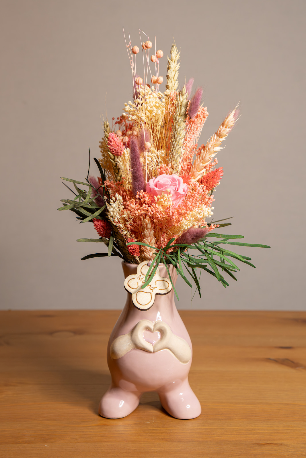 Este bonito jarrón con flores secas y una rosa preservada, todo ello de gran durabilidad, hará las delicias de toda mamá que lo reciba, va complementado con un detalle en madera con la palabra "mamá".