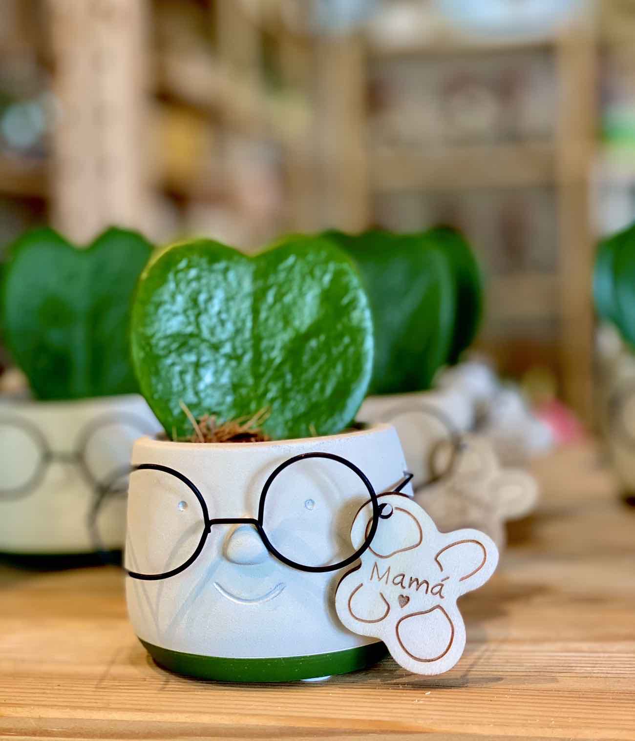 Maceta de cerámica con planta de Hoya, su forma de corazón la hace única en belleza, complementada para la ocasión con un bonito colgante de madera de "mamá"