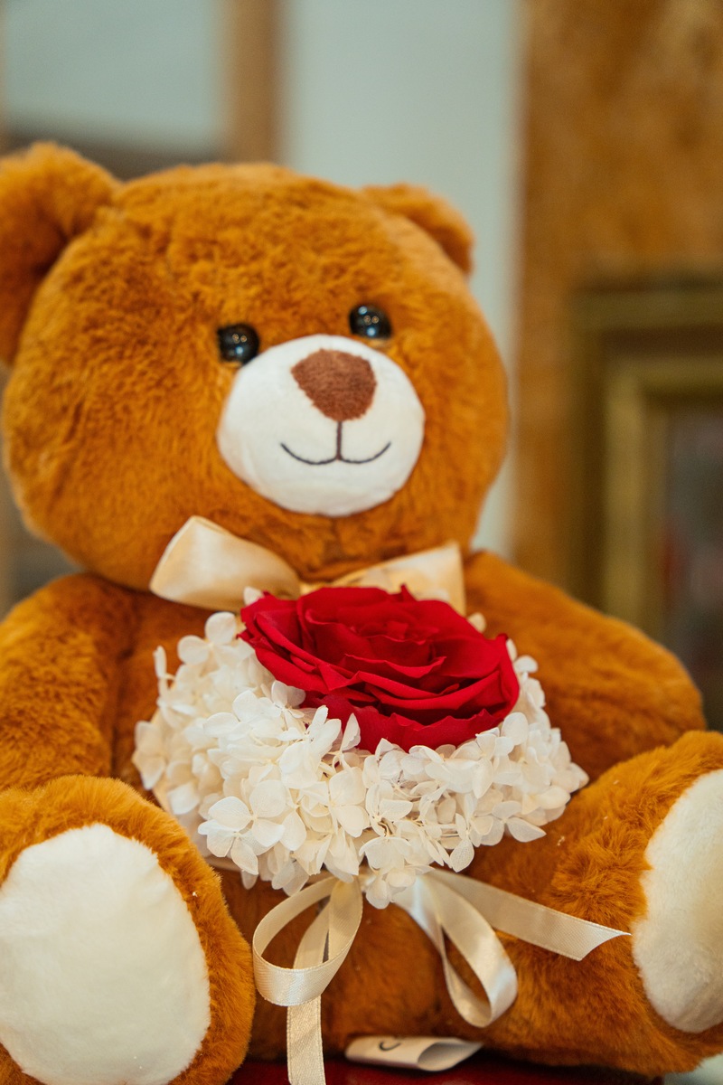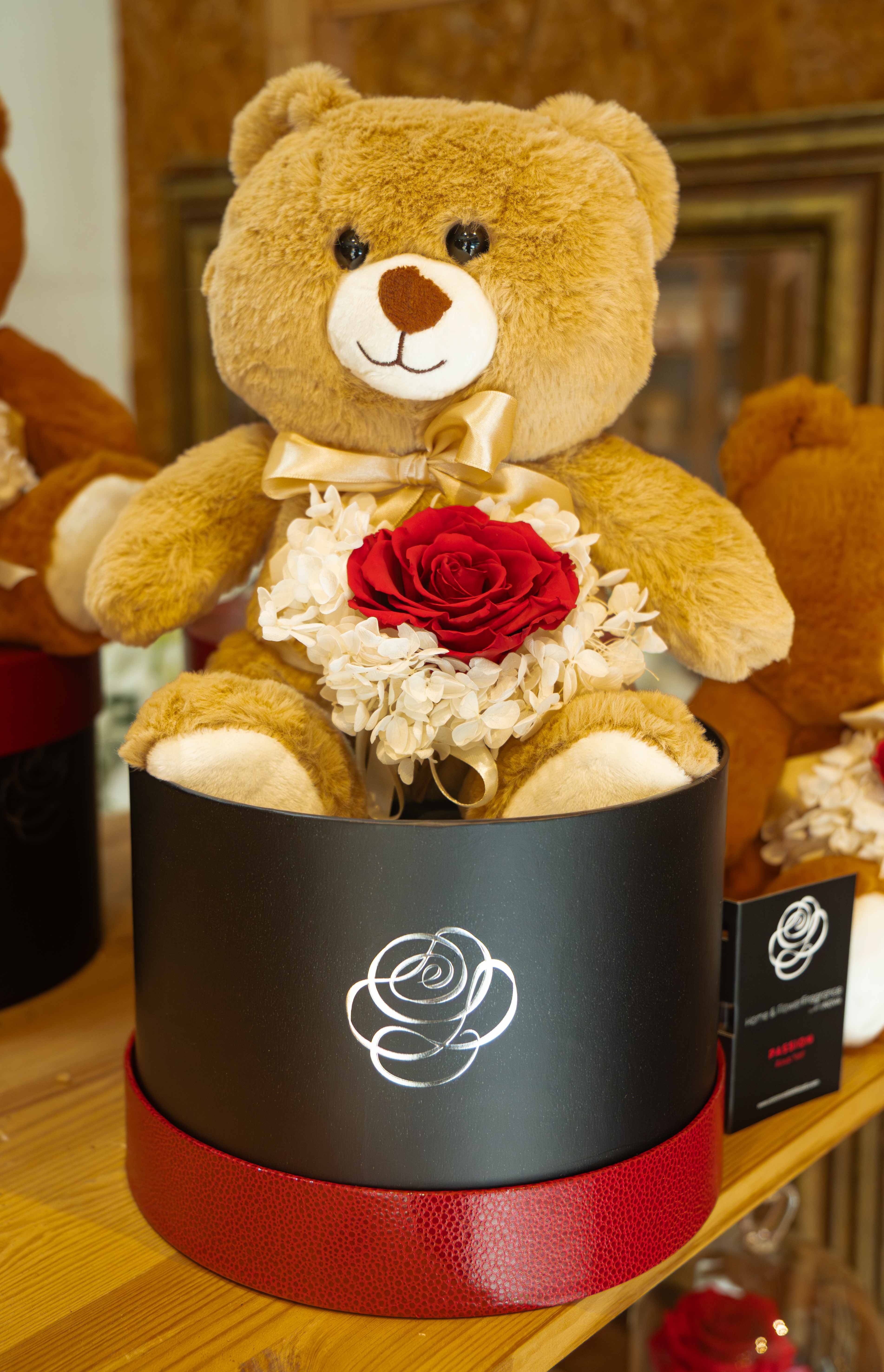Equilibrio entre ternura y elegancia: peluche + flor preservada.