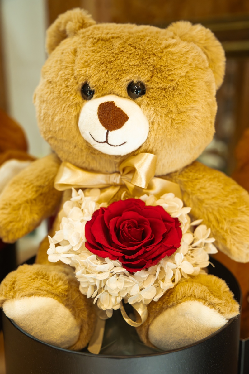 Un regalo romántico con el que es imposible no acertar. Este osito de peluche llega presentado en una caja decorativa, acompañado de una rosa preservada roja y hortensia preservada en tonos claros, creando un conjunto delicado, dulce y con presencia.
