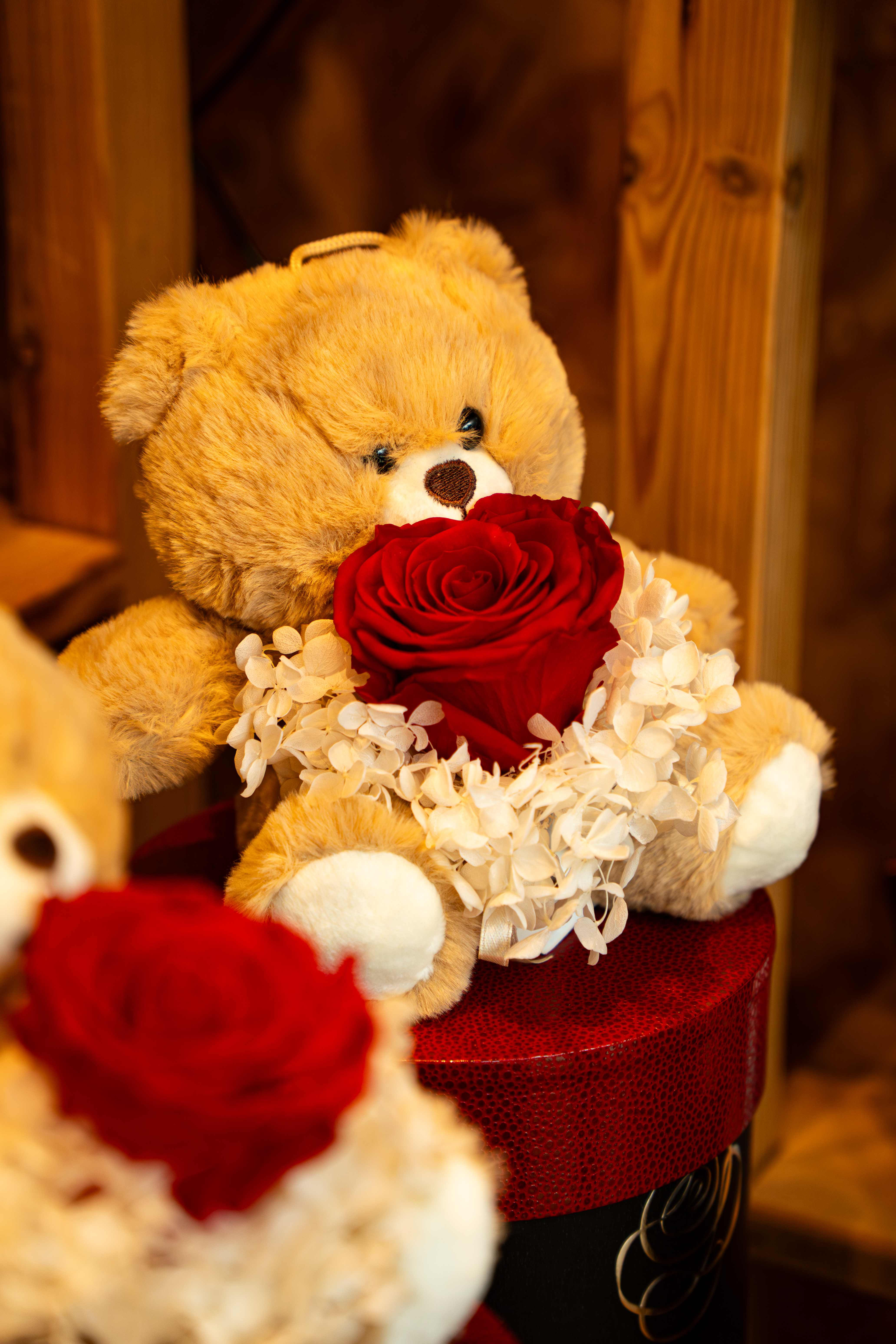 Equilibrio entre ternura y elegancia: peluche + flor preservada.