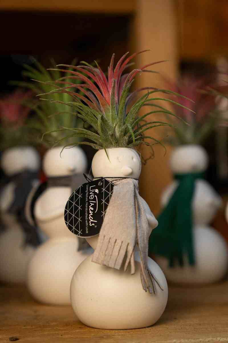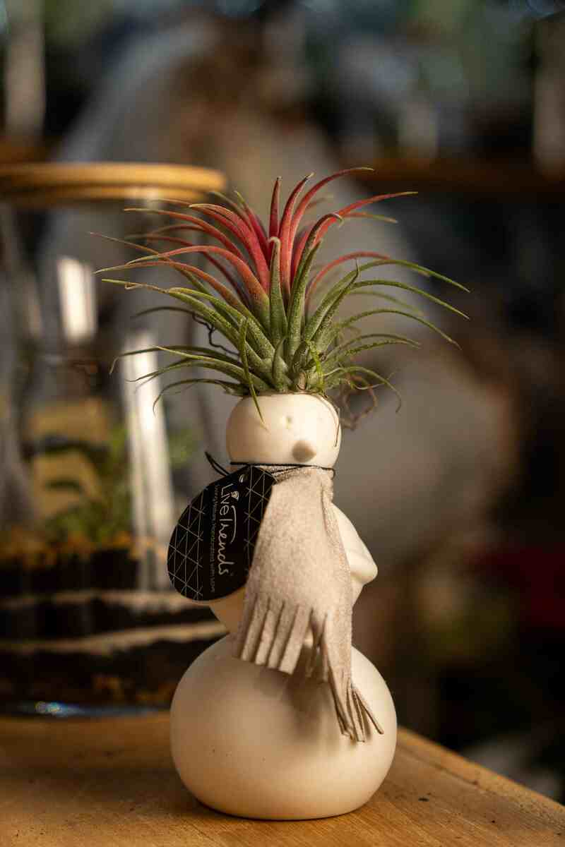 Figura de cerámica tipo muñeco de nieve con planta de aire Tillandsia, un regalo navideño original y fácil de cuidar para decorar hogar u oficina.