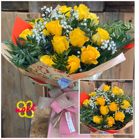 Demuestra tus sentimientos enviando a esa persona tan especial,esta alegre composición de rosas amarillas debidamente complementada con verdes variados y paniculata. El ramo se entrega presentado en una caja con agua y alimento, y complementado con un pink.