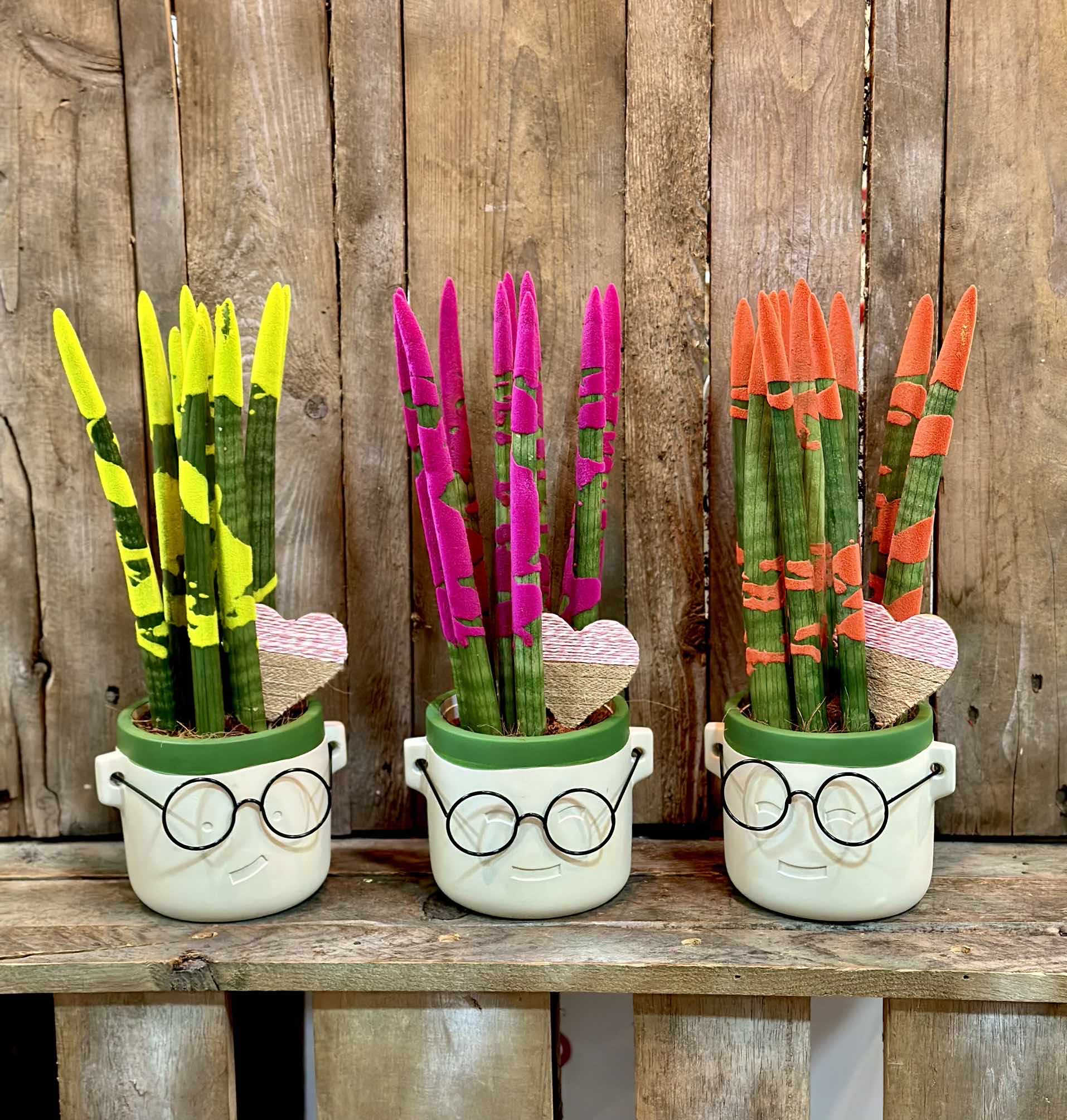 Planta de Sansevieria colores fosforitos en original maceta de niño Harry con gafas, complementado para la ocasión con un bonito pink de corazón en honor a esas madres que se dejan el suyo por nosotros.