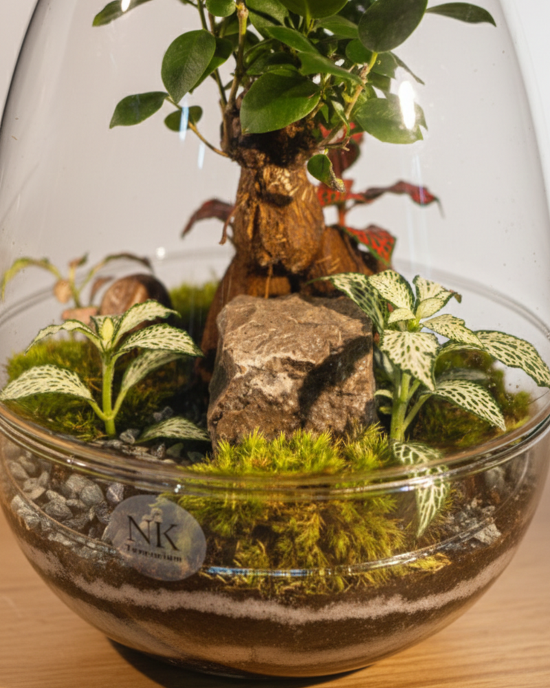 Silent Sanctuary es un pequeño refugio vegetal bajo cúpula: un paisaje vivo con estética de “mini bosque”, donde conviven musgo, fittonias y un árbol central que aporta altura y presencia. La roca protagonista y la composición tipo jardín japonés crean una escena tranquila, elegante y muy decorativa, perfecta para hogares luminosos y espacios de trabajo.