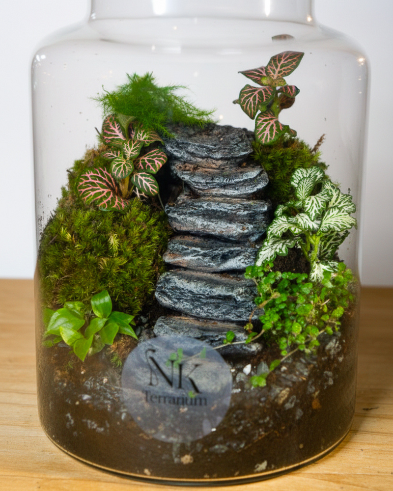 Este terrario es un pequeño paisaje en calma: una composición verde y frondosa donde el musgo crea la base de “bosque húmedo” y la piedra natural forma un camino en capas, como una mini escalera de roca. Entre el musgo aparecen dos protagonistas perfectas para terrario: la fittonia, con sus nervaduras marcadas y ese toque gráfico tan especial, y la Soleirolia soleirolii, una tapizante suave y compacta que aporta textura y sensación de “alfombra” verde.
